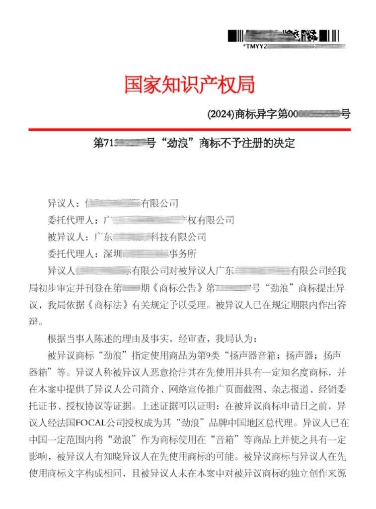 知名音响品牌“劲浪”遭遇商标抢注,权利人香港信和音响通过商标争议程序维护合法权利。在撤销同名商标过程中,“劲浪.商标”域名的权利归属与使用记录,成为强化在先权利与实际使用的关键证据。
